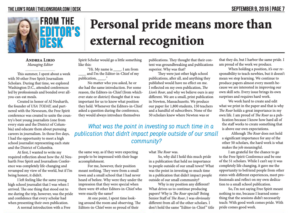 While in high school, I served as the Managing Editor of The Lion's Roar, an entirely student-run print newspaper. During my time there, I grew as a leader, writer, interviewer, and designer. Here are a few of my pieces.